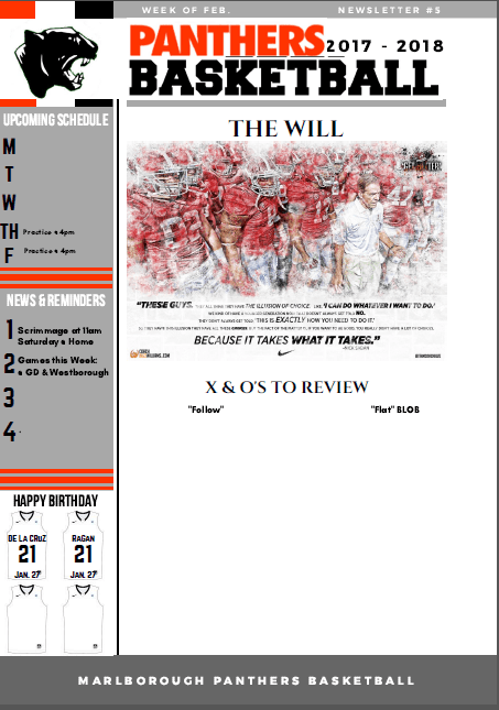 We started incorporating newsletters (“Canva Designs“) into our program last year as a reference for our players. What I found is that players were nto as prone to take a look at it, unless we brought it up in our team meetings or pre/post practice sessions. They started to understand that I might possibly “pop-quiz” them and made sure they weren’t unprepared for it. Below is a drafted example of our weekly newsletter that we would use. This is not a completed product however it gives the template of what we tried to provide: a topic of discussion for the week (“The Will”), our upcoming schedule, any reminders (e.g. fundraising, study halls, etc.), birthdays in our program, and diagrams for any of the “X’s & O’s” put in recently.