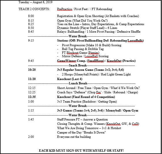 During the actual camp, for the younger group, we tend to put together a couple small hoops (set at 7 feet) with the use of girl’s basketballs for all campers. Our focus that we communicate with our staff (Varsity Student-Athletes) is to create a (1) fun environment, (2) a positive experience, and (3) provide one thing that they can go home with related to the game of basketball. In doing so we try to accommodate all skill levels through the use of a lot of basketball-related activities, competitions, and small-team games. The older group will look very similar in structure based on the schedule, differing largely by the amount of skill-specific drills or number of games played throughout the week.