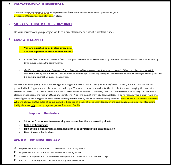 Prior to coaching at the high school level – as an assistant at Division III program – our head coach incorporated a similar freshman and GPA study-hall rule. This was not deemed as a punishment as any of our student-athletes were encouraged to attend, particularly our captains to influence others to take advantage of the opportunity. All freshman were required to attend our bi-weekly study hall, while any upperclassmen below a 2.75 cumulative GPA also had to attend. This intended to get the freshman class off to a good start. It also gave us more facetime with them and additionally allowed upper-classmen to interact with the younger student-athletes possibly grooming them or taking some under their wing. As for upperclassmen, we wanted them to continue to prioritize their grades and not let it get to a point where they started to lose track towards graduation.