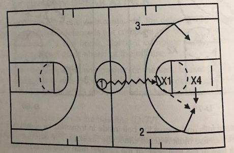 - As soon as the pass is made, the backside defender takes the ball while the perimeter defender on the ball is forced to drop splitting the court in half. At this point, the off-ball defender should be communicating to recovering teammates that there are two offensive players and directing traffic to the nearest teammate where to match-up. See video clip below for example.