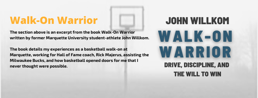 On Monday, Chris Teff, Rob Hanley, and I would have our first strength and conditioning session with strength coach, Scott Holsopple. Rob was our third walk-on and was a freshman from Waukesha Catholic Memorial (WI). Going back to Scott, the man stood about 5’8”, was built square to the ground, and always wore sweatpants. He had been an All-American boxer at Penn State University and worked there as a strength coach before arriving at Marquette. The session was scheduled for 6:00 a.m., and none of us knew what to expect. We figured he would put us through a variety of exercises to see how strong we were and set up a program thereafter based on those numbers. Chris and I were in bed by ten o’clock that night, as first impressions were important, and I wanted to be ready to perform at a high level.