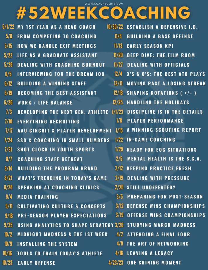 Following the last game of the season with time built in between to decompress, the staff will begin scheduling exit meetings in the Spring. For underclassmen, it is an opportunity to identify a progression plan between the off-season and pre-season. The athletes graduating or moving on from the program share their experiences and address how we can help them prepare for the future. As coaches, we use these interactions to continue shaping program identity and prepare an action plan to support everyone moving forward.